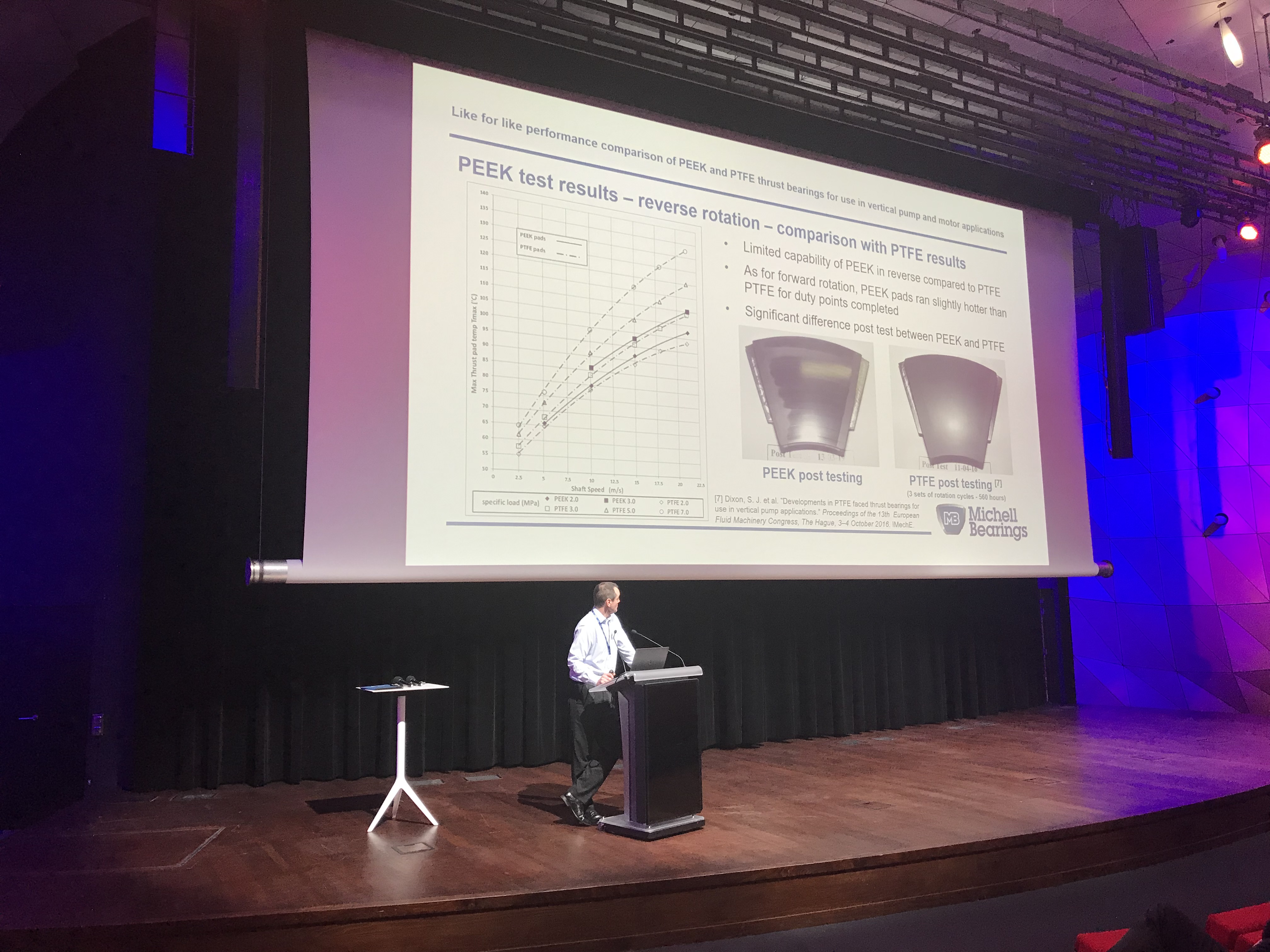 Paul präsentierte seine Forschungsarbeit „Like for like performance comparison of PEEK and PTFE thrust bearings for use in vertical pump and motor applications“, die von ihm selbst, John Butler (Design Office Manager) und Steve Dixon (Chief Executive Officer) verfasst wurde.